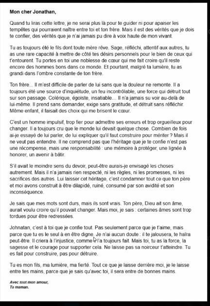 Il s'agit d'une lettre donnée à Jonathan par sa mère. La lettre a été retrouvée par Larry Colby dans les cartons du taxidermistes, le frêre de Jonathan évoqué dans la lettre.